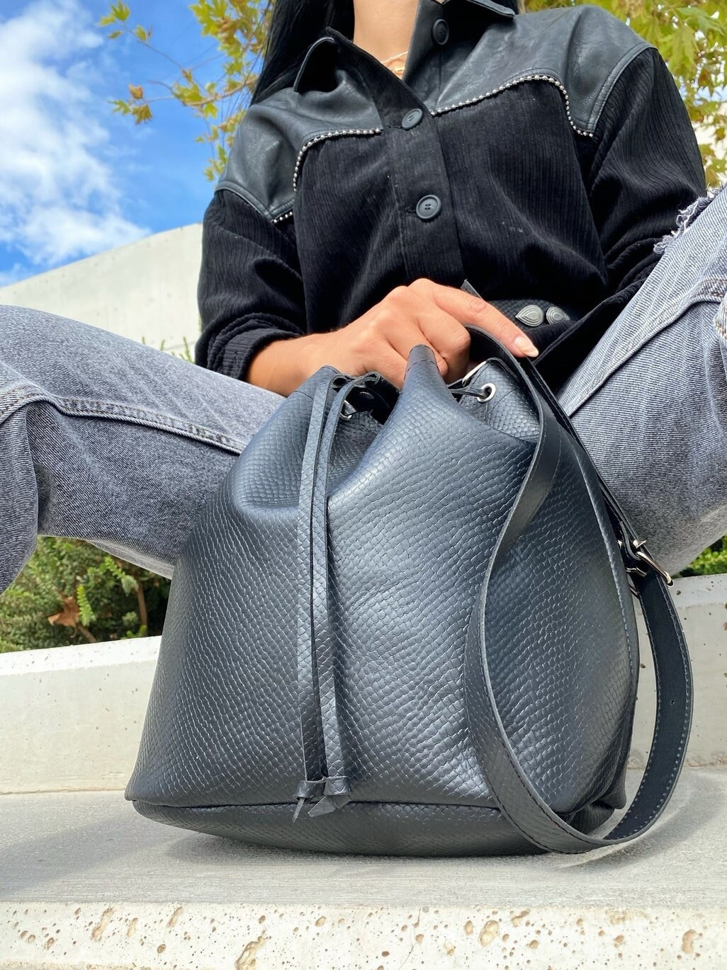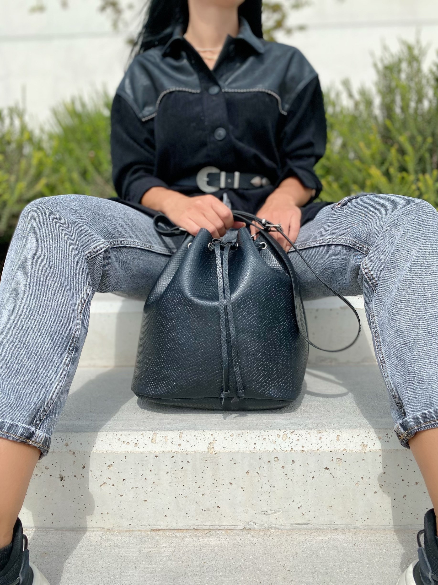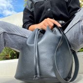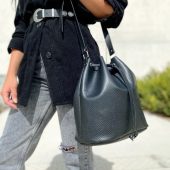 My new leather bucket bag in black color is a unique creation for every woman. There is a huge interior where you can add all your personal belongings and this special type of leather is made from 100% ful grain cowleather.Find it only at our Store.