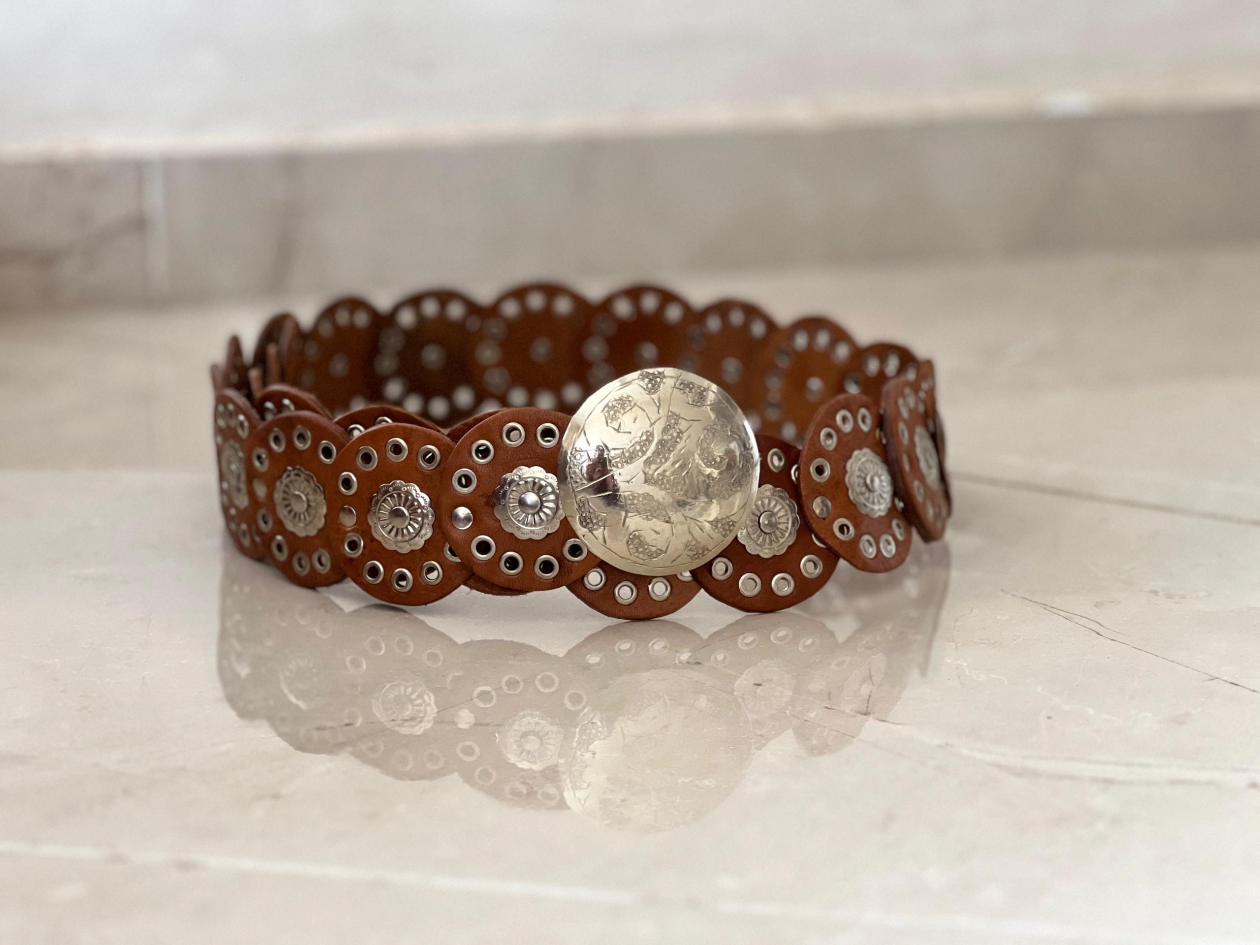 🎁 Searching for a special gift? This handmade leather concho belt (110 cm / 43.3 in) blends timeless charm with bold style. Its vintage round concho design and engraved buckle make it perfect as a medieval belt, a studded waist belt, or even a unique halloween costume belt.