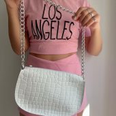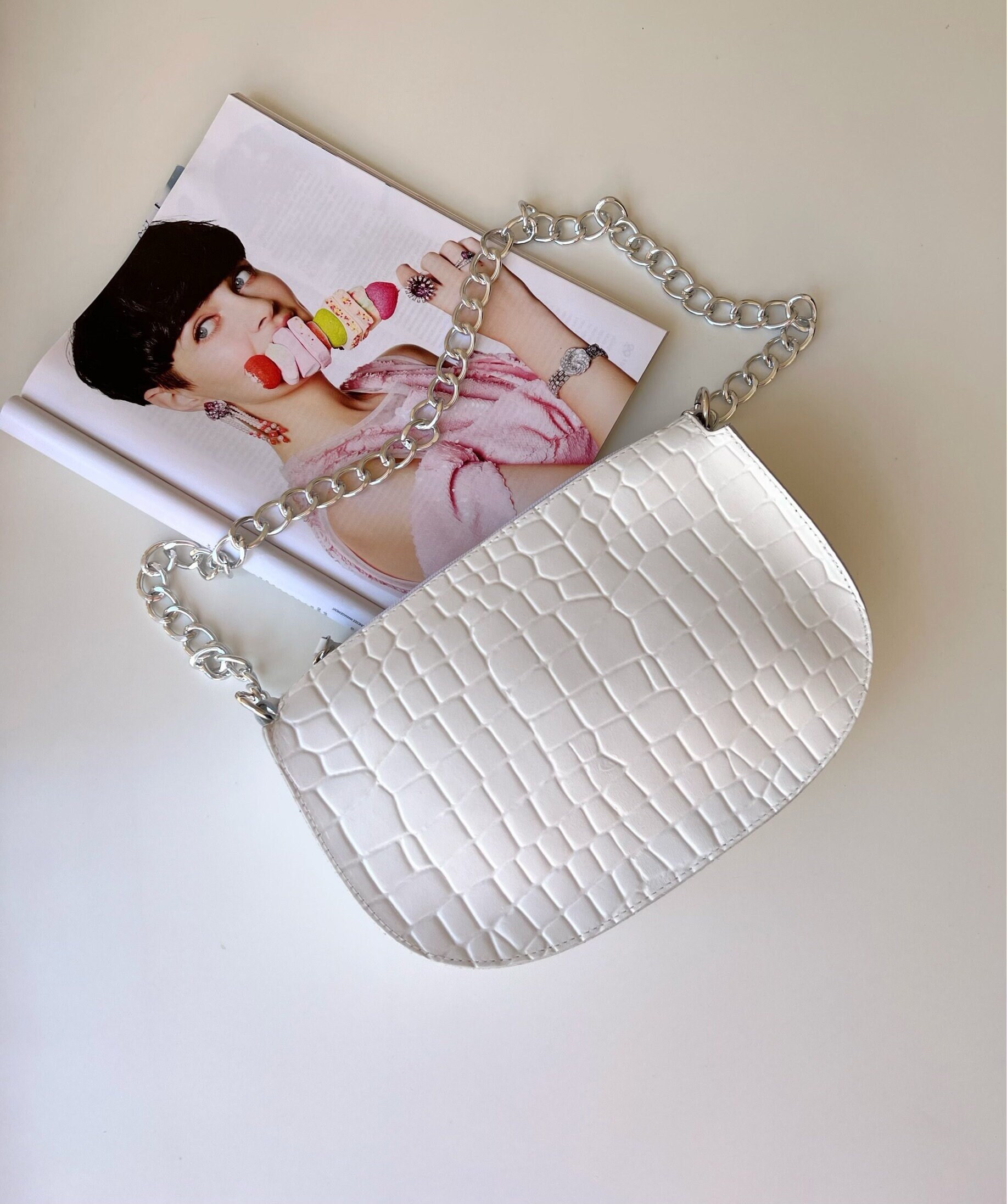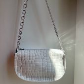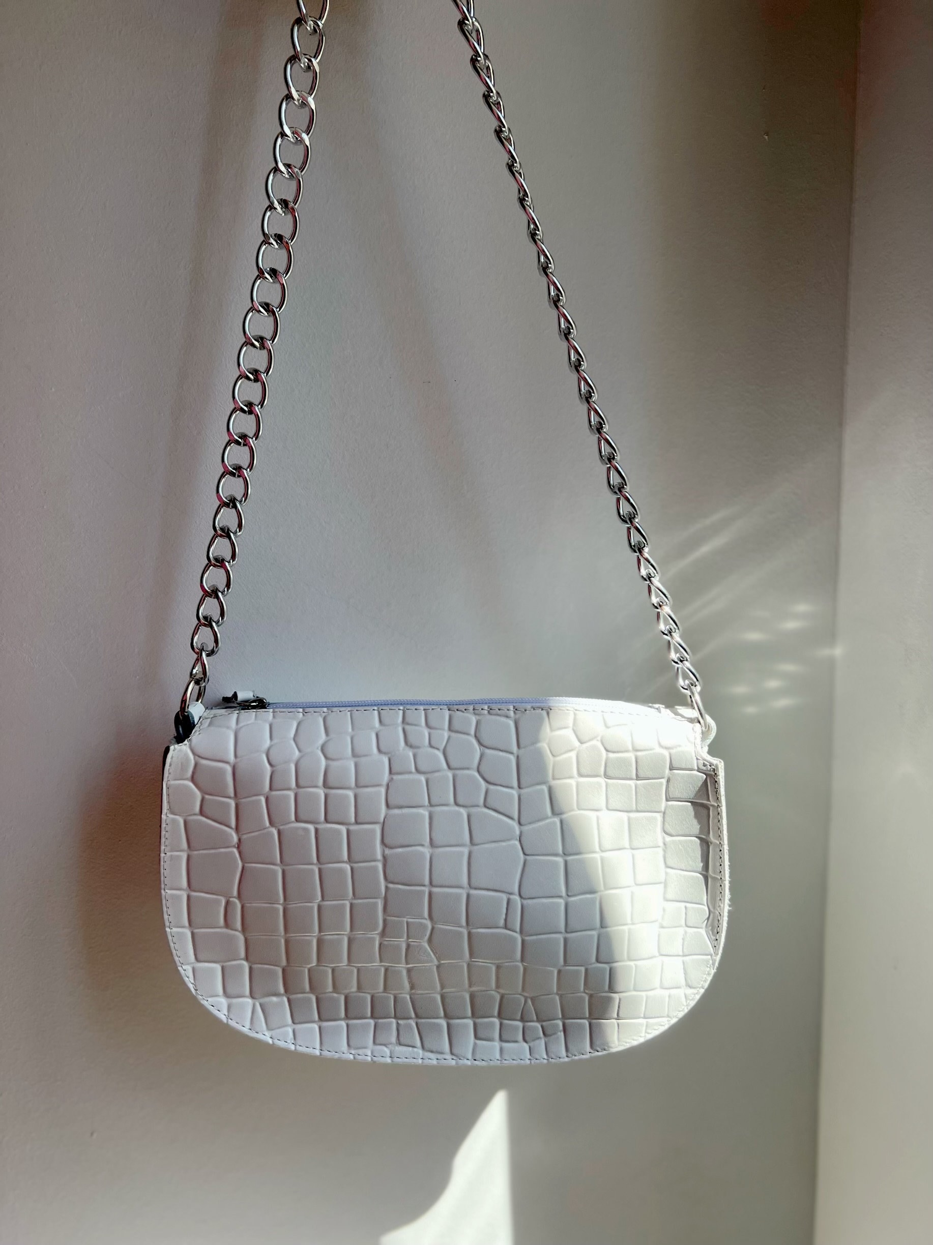 Introducing our exquisite Handmade Leather Shoulder Bag – a testament to timeless elegance. Crafted with utmost care and precision, this bag is made from the finest Full Grain Leather, showcasing an enchanting White hue aptly named ”Pure White”. The remarkable croco print design further enhances its allure, creating a truly spellbinding accessory. The bag’s zippered top grants convenient access, while the spacious interior promises to accommodate your essentials effortlessly. Embrace versatility with the addition of a Silver Chain from Aluminium, allowing you to wear it as a shoulder or crossbody bag. Exclusive to our Store.